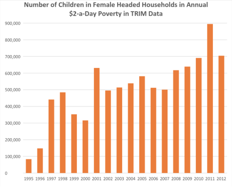Using the most comprehensive dataset ever assembled linking survey data to administrative earnings and benefits data, Meyer et al find that the group that mirrors the one Edin and I describe in our book—reporting extreme low cash incomes but receiving in-kind benefits— experiences the very highest rates of material hardship of any they examine. They conclude that these families “appear to be considerably worse off than those in official poverty.” Even further, their analysis shows that by far the greatest concentration of this group is among single parent families with children, exactly the group most impacted by welfare reform.